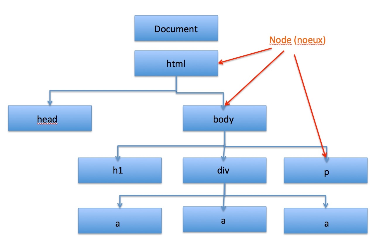 DOM : vision objet d’une page HTML. Chaque objet crée un nouveau nœud (node) de l’arborescence du document.